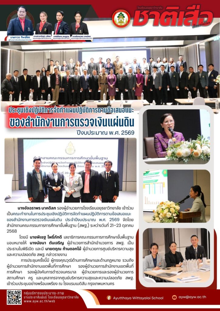 ระหว่างวันที่ 21-23 ตุลาคม 2568 นางอัจฉราพร นาคดิลก รองผู้อำนวยการโรงเรียนอยุธยาวิทยาลัย เข้าร่วมเป็นคณะทำงานการประชุมเชิงปฏิบัติการจัดทำแผนปฏิบัติการตามข้อเสนอแนะของสำนักงานการตรวจเงินแผ่นดิน ปีงบประมาณ พ.ศ. 2569 จัดโดยสำนักงานคณะกรรมการการศึกษาขั้นพื้นฐาน โดยมี นายพิเชฐ โพธิ์ภักดี เลขาธิการคณะกรรมการการศึกษาขั้นพื้นฐาน มอบหมายให้ นางนัยนา ตันเจริญ ผู้อำนวยการสำนักอำนวยการ สพฐ. เป็นประธานในพิธีเปิด ทั้งนี้ นายตฤณ ก้านดอกไม้ ผู้อำนวยการศูนย์บริหารความสุขและความปลอดภัย สพฐ. กล่าวรายงาน รวมถึงผู้ทรงคุณวุฒิด้านการศึกษา ผู้ทรงคุณวุฒิด้านกฎหมาย ผู้อำนวยการสำนักงานเขตพื้นที่การศึกษา รองผู้อำนวยการสำนักงานเขตพื้นที่การศึกษา รองผู้บังคับการตำรวจนครบาล ผู้อำนวยการและรองผู้อำนวยการสถานศึกษา ครู และบุคลากร จากศูนย์บริหารความสุขและความปลอดภัย สพฐ. เข้าร่วมประชุม ณ โรงแรมเมดิสัน กรุงเทพมหานคร