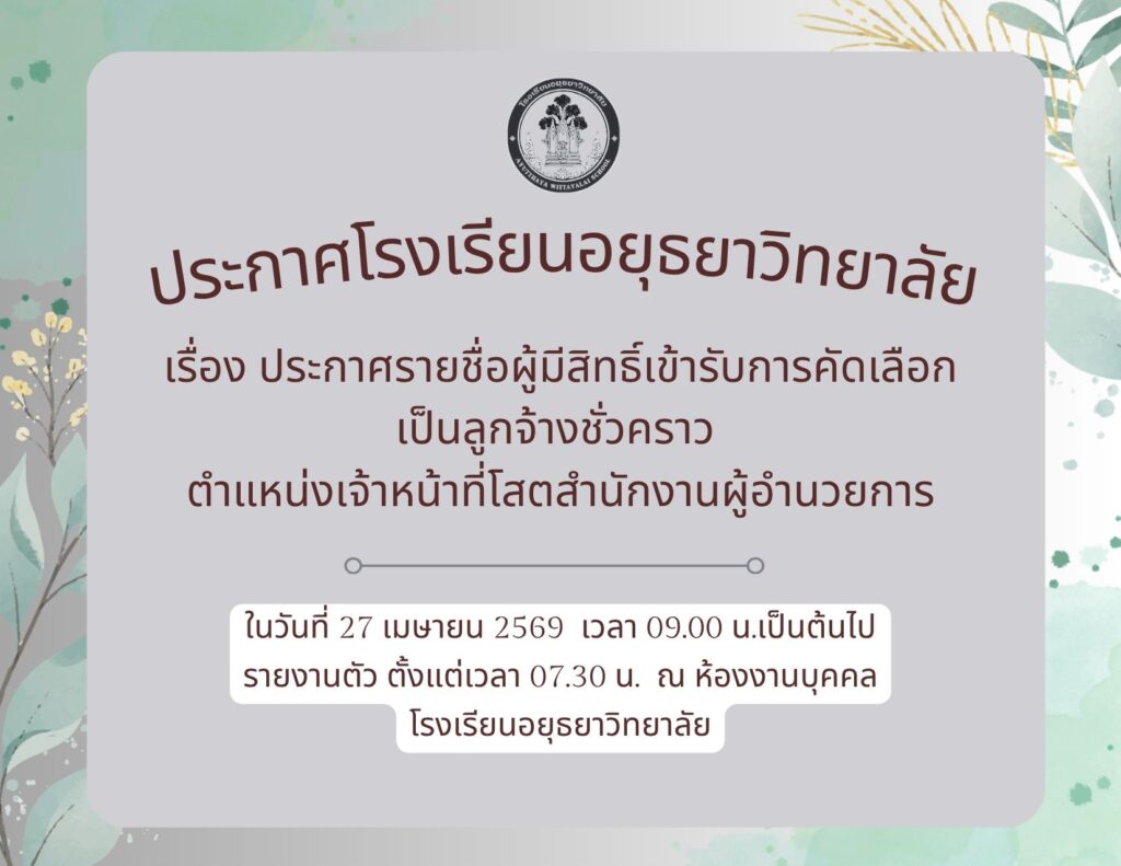 กลุ่มบริหารงานบุคคลฯ ประกาศ สำนักงานผู้อำนวยการ ไม่มีหมวดหมู่ ประกาศรายชื่อผู้มีสิทธิ์เข้ารับการคัดเลือก ตำแหน่ง เจ้าหน้าที่โสตสำนักงานผู้อำนวยการ กันยารัตน์ ศรีวงค์วรรณ เมษายน 24, 2026 0 ประกาศรายชื่อผู้มีสิทธิ์เข้ารับการคัดเลือก ตำแหน่ง เจ้าหน้าที่โสตสำนักงานผู้อำนวยการดาวน์โหลด Post Views: 8 Continue Reading Previous ตารางเรียนภาคเรียนที่ 1/2569 More Stories ประกาศ ประกาศโรงเรียนอยุธยาวิทยาลัย การจ้างเหมาบริการ กันยารัตน์ ศรีวงค์วรรณ เมษายน 21, 2026 0 ไม่มีหมวดหมู่ ประกาศโรงเรียนอยุธยาวิทยาลัย เรื่อง รับสมัครบุคคลเพื่อคัดเลือกเป็นลูกจ้างชั่วคราว ตำแหน่งเจ้าหน้าที่โสตสำนักงานผู้อำนวยการ กันยารัตน์ ศรีวงค์วรรณ เมษายน 2, 2026 0 ไม่มีหมวดหมู่ อยุธยาวิทยาลัยจัดอบรม “Smart PA for Teachers” ยกระดับศักยภาพครูสู่มืออาชีพ นนทกาล รูปเอี่ยม มีนาคม 30, 2026 0 ใส่ความเห็น ยกเลิกการตอบอีเมลของคุณจะไม่แสดงให้คนอื่นเห็น ช่องข้อมูลจำเป็นถูกทำเครื่องหมาย *ความเห็น * ชื่อ * อีเมล * เว็บไซต์ Δ