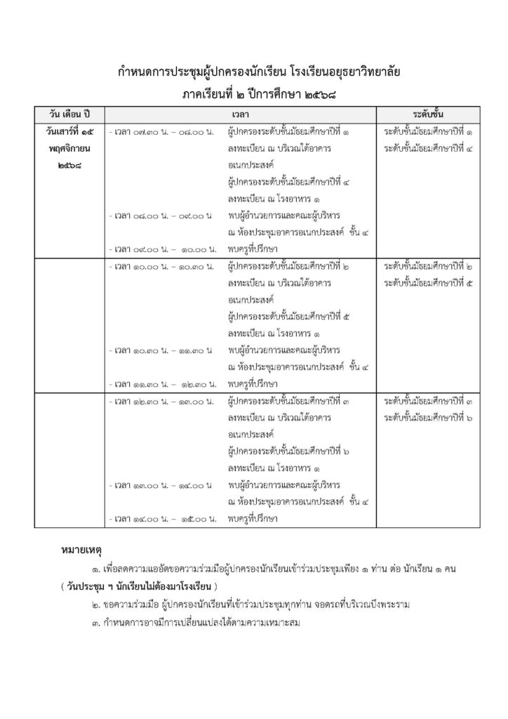 กำหนดการประชุมผู้ปกครอง ภาคเรียนที่ 2/2568